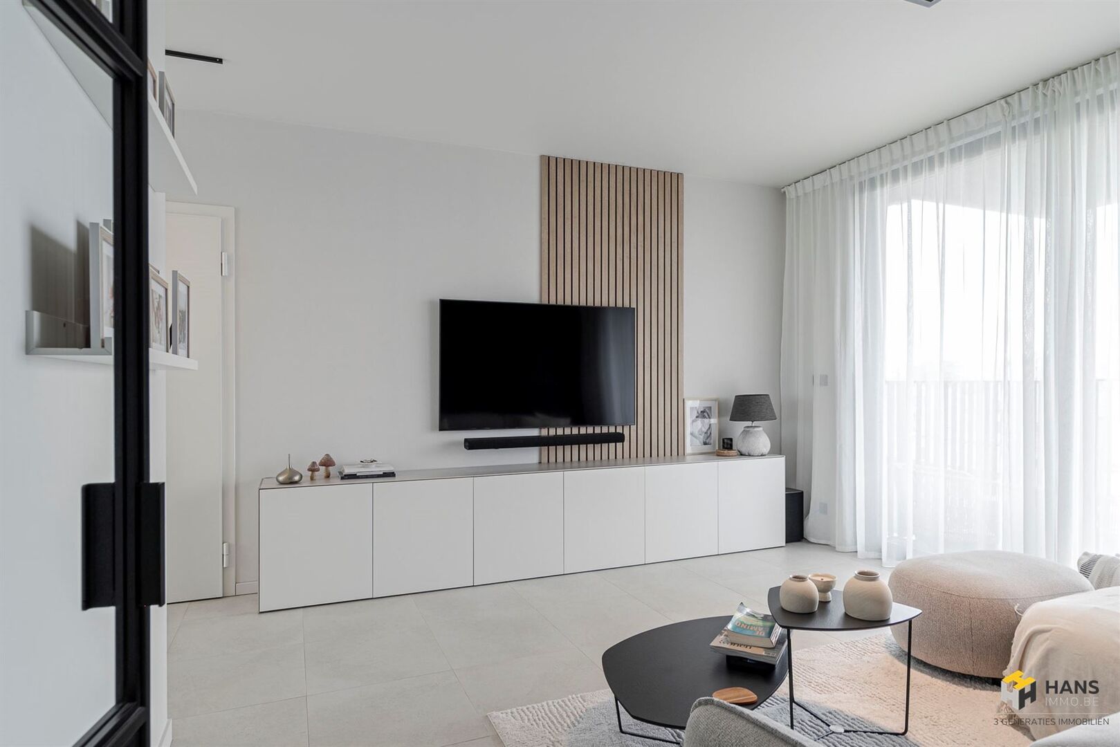 Via de veiligheidsdeur kom je binnen in de lichtrijke leefruimte (35 m²) met slimme indeling, waardoor de woonkamer en open keuken mooi van elkaar gescheiden zijn. De keuken is uitgerust met de gebruikelijke, kwalitatieve toestellen, waaronder een kookvuur, dampkap, combi-oven, vaatwasser en frigo, en daarnaast nog een ingebouwde koffiemachine en wijnkast. Aansluitend bevindt zich een berging/wasplaats (3 m²).
