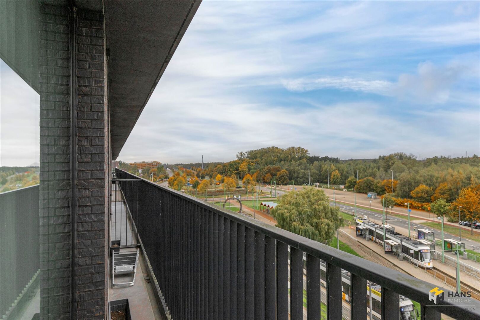 Buitenruimte is er in overvloed: vooraan een balkon (5 m²) met zicht op de Middenvijver en achteraan een zuid-georiënteerd terras (17 m²). Verder beschikt het appartement over 2 slaapkamers (9 m² en 15 m²), een badkamer (4 m²) met inloopdouche, lavabo en handdoekdroger, en een aparte wc.