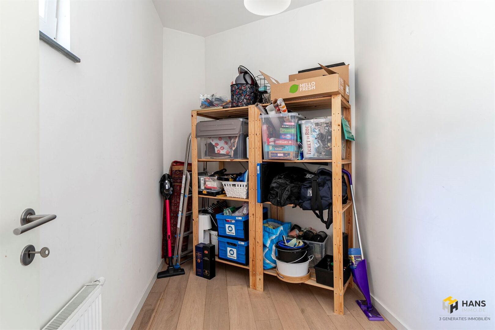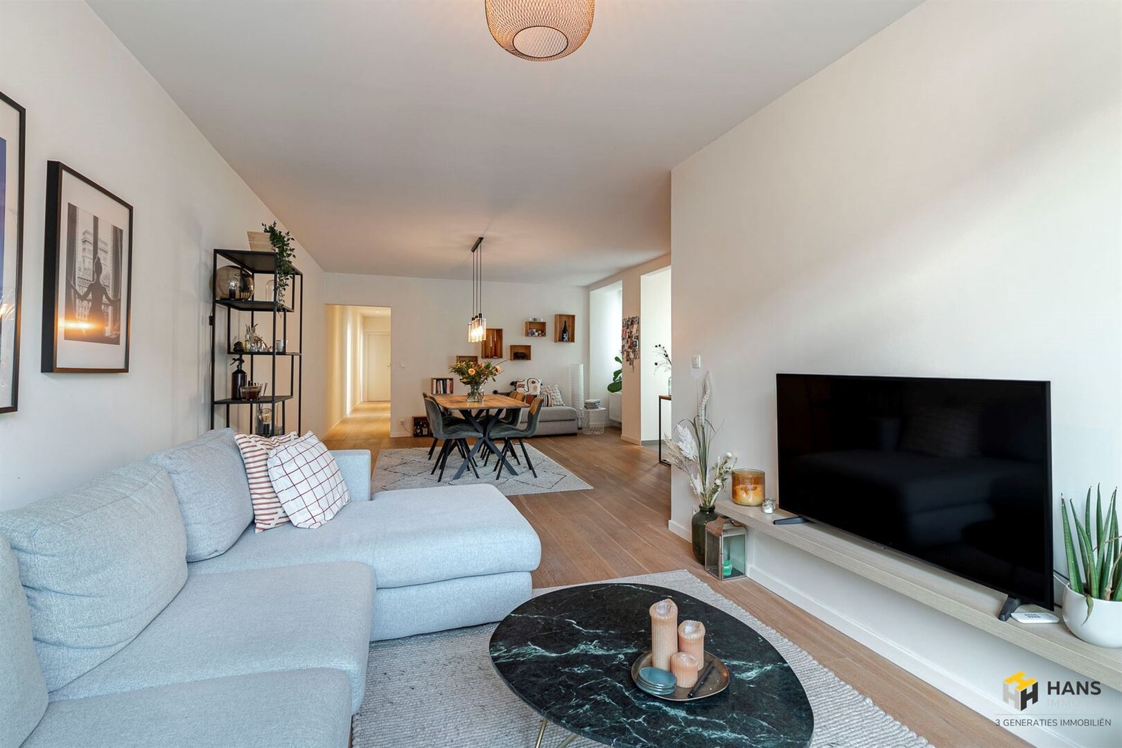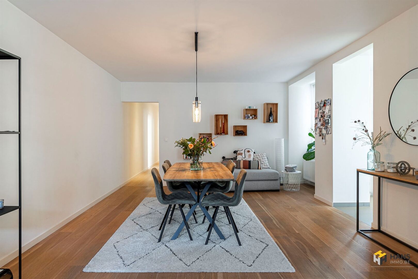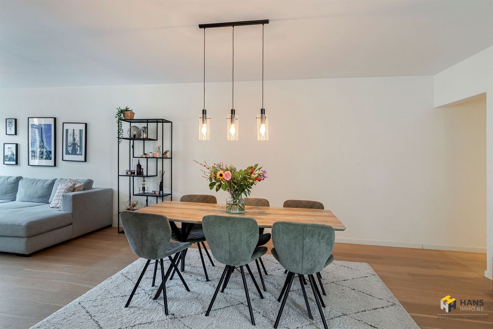 Via de inkomhal (4 m²) betreden we de ruime leefruimte op parket (45 m²). Aansluitend bevindt zich de keukenhoek (8 m²), uitgerust met kwalitatieve SIEMENS-toestellen. Vanuit de nachthal bereiken we de 2 volwaardige slaapkamers van gelijke grootte (13 m²), de ruime badkamer (10 m²) met inloopdouche, dubbele lavabo en wc, én een extra kamer (5,6 m²) die perfect kan dienen als berging, bureau, dressing of extra slaapkamer.