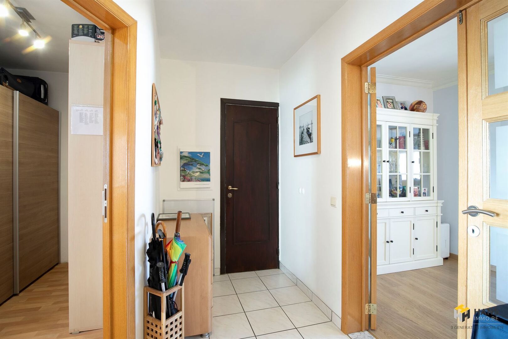 Via de inkomhal, die alle ruimtes met elkaar verbindt, bereik je vooraan de lichtrijke woonkamer (33 m²) met aansluitend de aparte keuken (9 m²) met kookvuur, dampkap, ingebouwde frigo, vriezer, vaatwasser en microgolf. Achteraan bevinden zich de 2 slaapkamers (9 m² en 14 m²), waarvan één met toegang tot het zuid-georiënteerde terras (3 m²). Verder beschik je over een berging/dressing (6 m²) en badkamer (4 m²) met ligbad/douche, toilet en lavabomeubel.