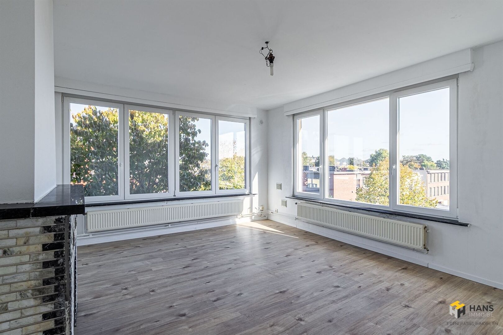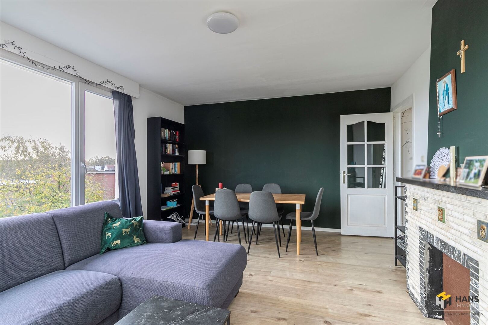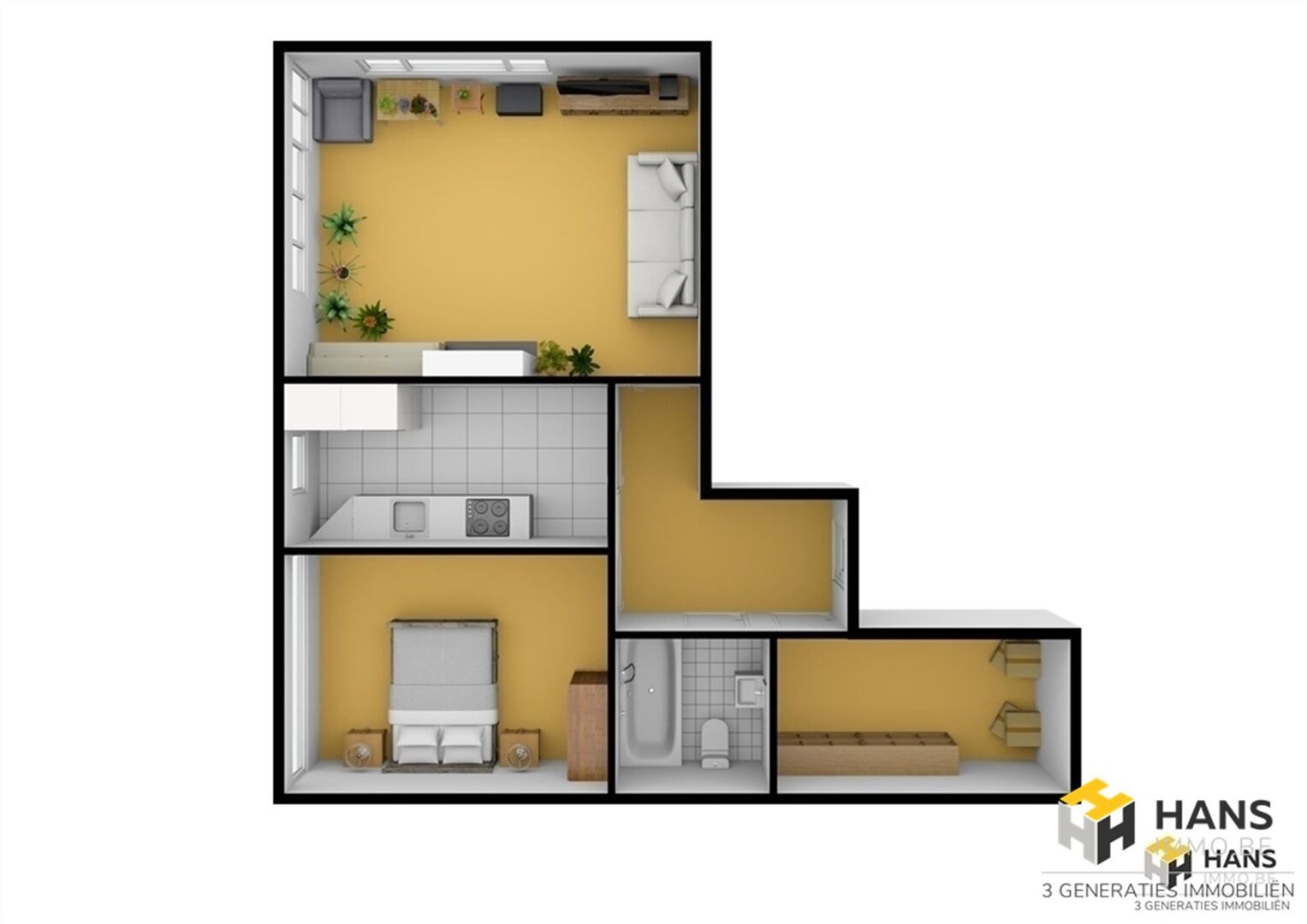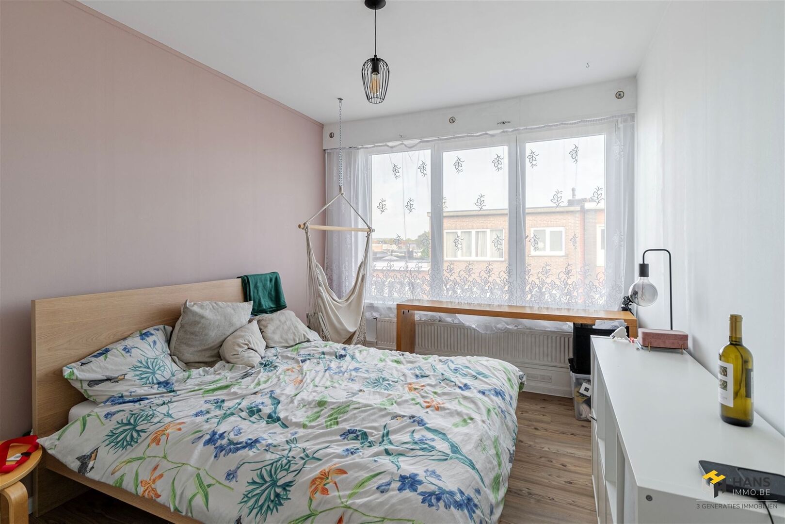 We betreden de gezellige woonst in de L-vormige centrale hal, die alle aanwezige ruimtes met elkaar in verbinding stelt. Links treffen we een ruime berging (8 m²) met daarnaast de badkamer (4 m²), dewelke afgewerkt is met een ligbad/douche, wc en lavabo. De oppervlakte van de slaapkamer bedraagt 13 m² en dankzij het grote raam valt er hier een aangename hoeveelheid daglicht binnen. De aparte keuken (9 m²) is voorzien van een oven, gasvuur, dampkap en spoelbak. De woonkamer (23 m²) bevindt zich in de hoek van het appartement, waardoor deze ruimte in het licht baadt. Tot slot zijn er nog 2 kelderbergingen ter beschikking. Voor meer info of een gratis schatting surf naar www.hansimmo.be