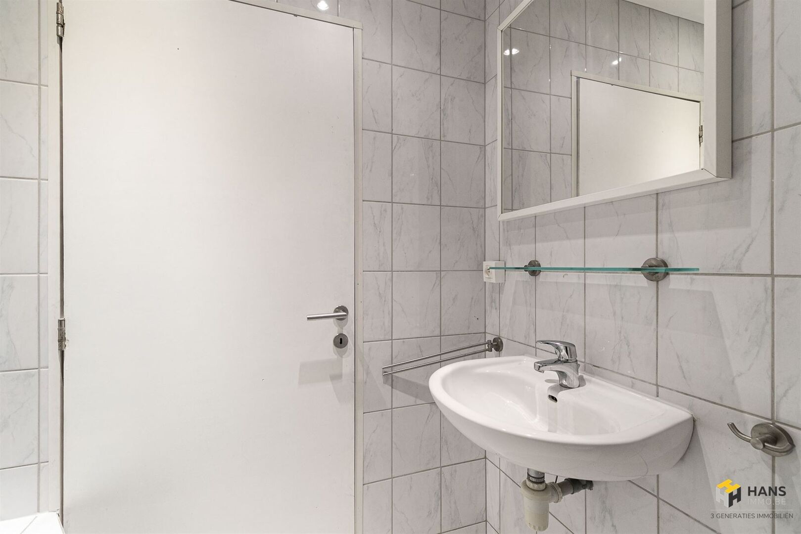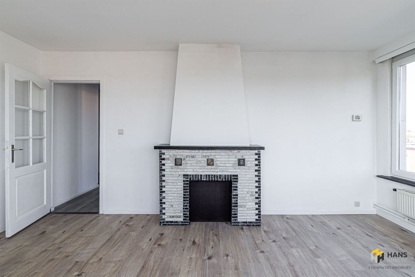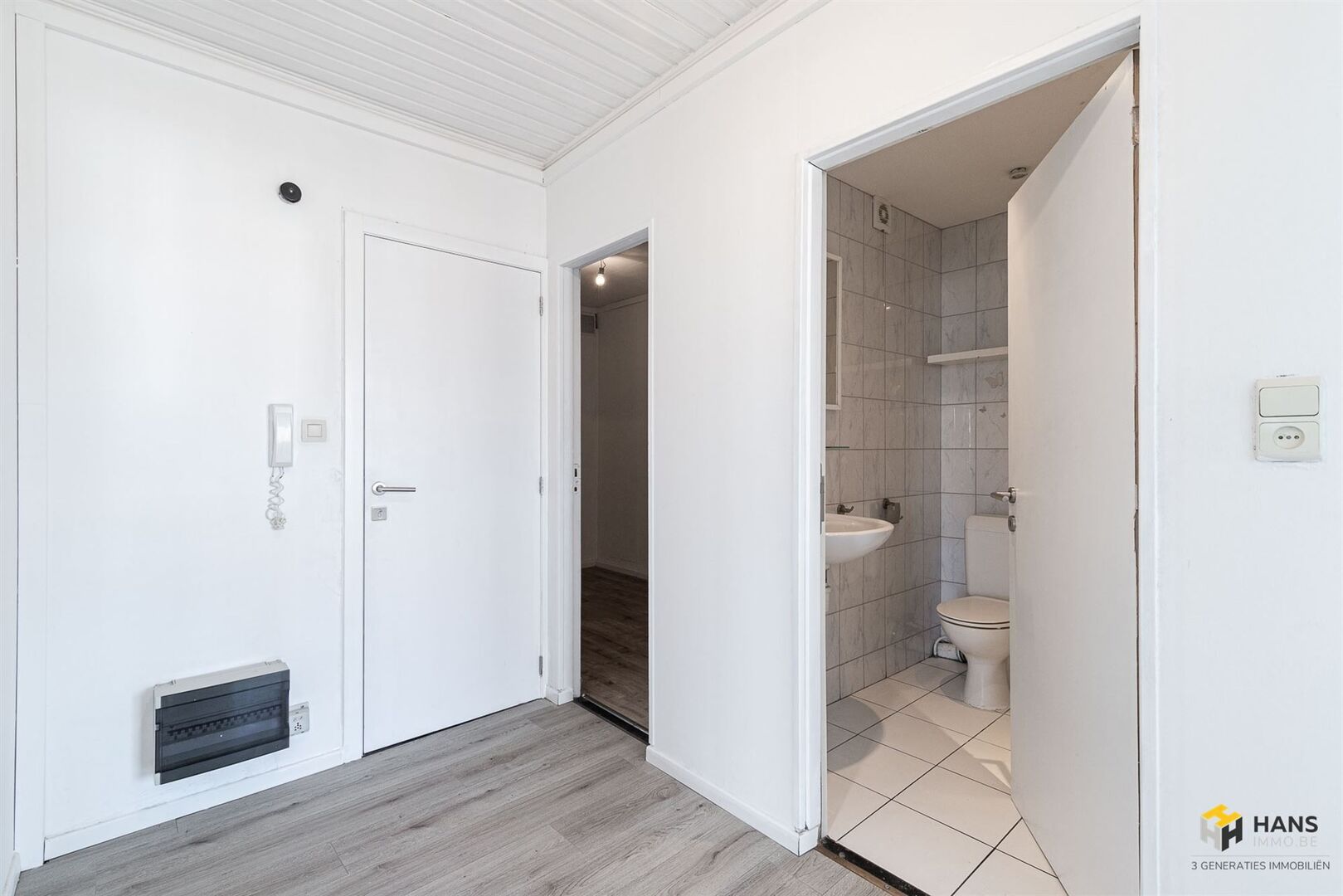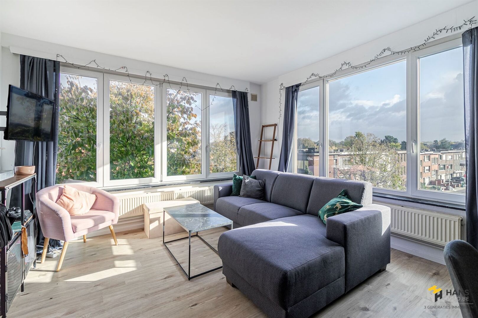 We betreden de gezellige woonst in de L-vormige centrale hal, die alle aanwezige ruimtes met elkaar in verbinding stelt. Links treffen we een ruime berging (8 m²) met daarnaast de badkamer (4 m²), dewelke afgewerkt is met een ligbad/douche, wc en lavabo. De oppervlakte van de slaapkamer bedraagt 13 m² en dankzij het grote raam valt er hier een aangename hoeveelheid daglicht binnen. De aparte keuken (9 m²) is voorzien van een oven, gasvuur, dampkap en spoelbak. De woonkamer (23 m²) bevindt zich in de hoek van het appartement, waardoor deze ruimte in het licht baadt. Tot slot zijn er nog 2 kelderbergingen ter beschikking. Voor meer info of een gratis schatting surf naar www.hansimmo.be