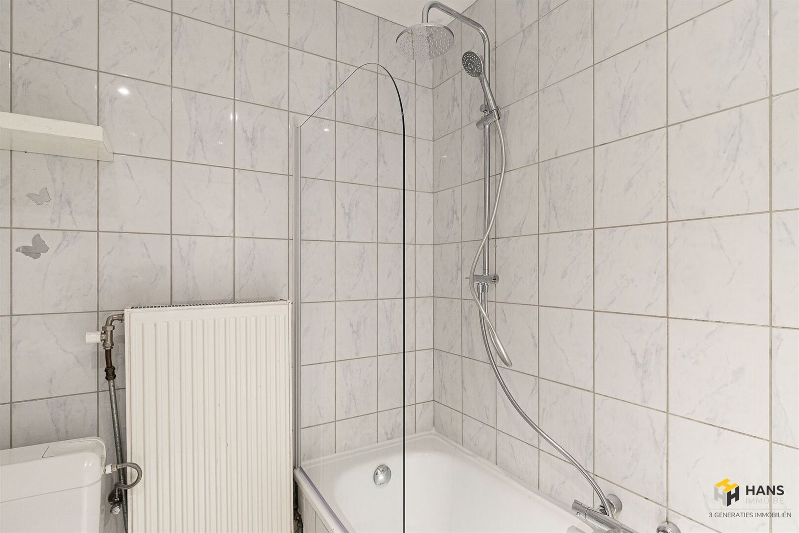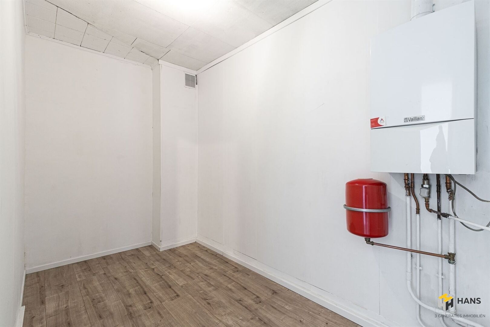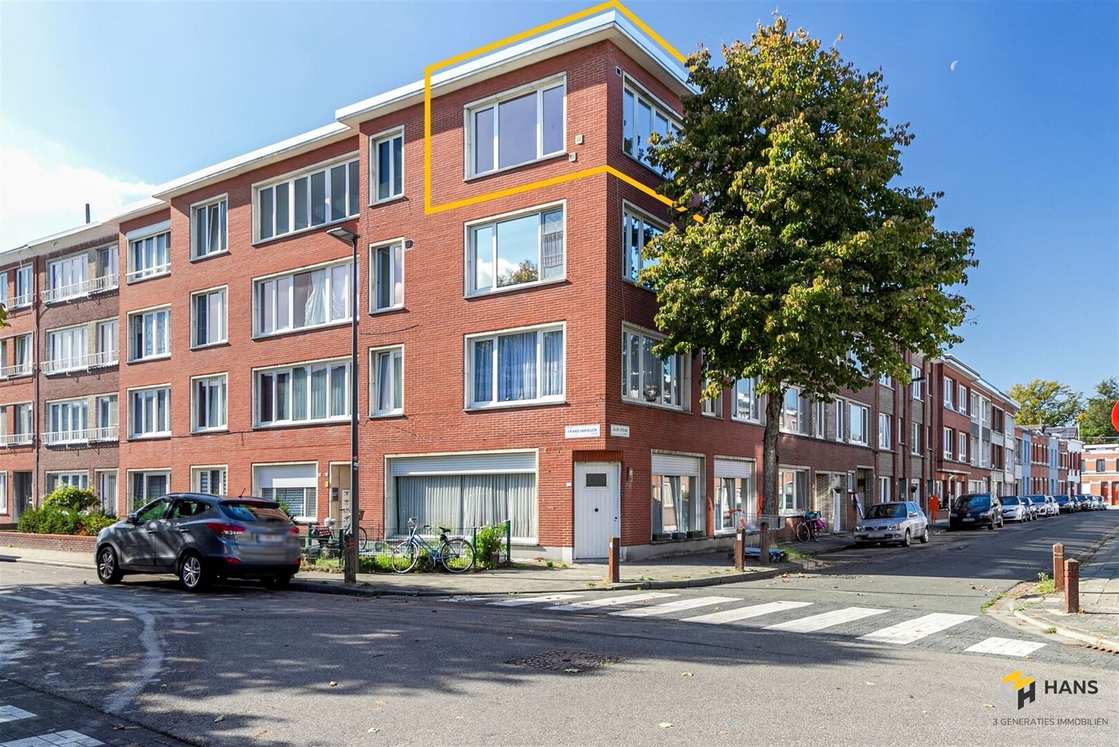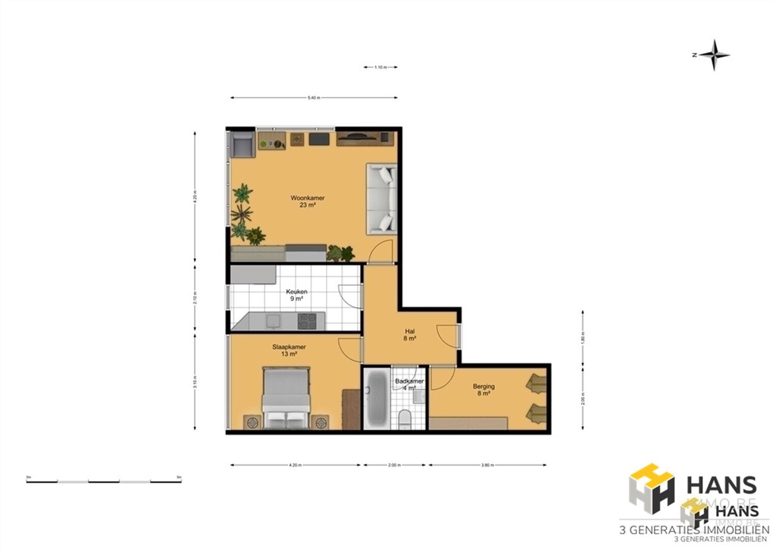We betreden de gezellige woonst in de L-vormige centrale hal, die alle aanwezige ruimtes met elkaar in verbinding stelt. Links treffen we een ruime berging (8 m²) met daarnaast de badkamer (4 m²), dewelke afgewerkt is met een ligbad/douche, wc en lavabo. De oppervlakte van de slaapkamer bedraagt 13 m² en dankzij het grote raam valt er hier een aangename hoeveelheid daglicht binnen. De aparte keuken (9 m²) is voorzien van een oven, gasvuur, dampkap en spoelbak. De woonkamer (23 m²) bevindt zich in de hoek van het appartement, waardoor deze ruimte in het licht baadt. Tot slot zijn er nog 2 kelderbergingen ter beschikking. Voor meer info of een gratis schatting surf naar www.hansimmo.be