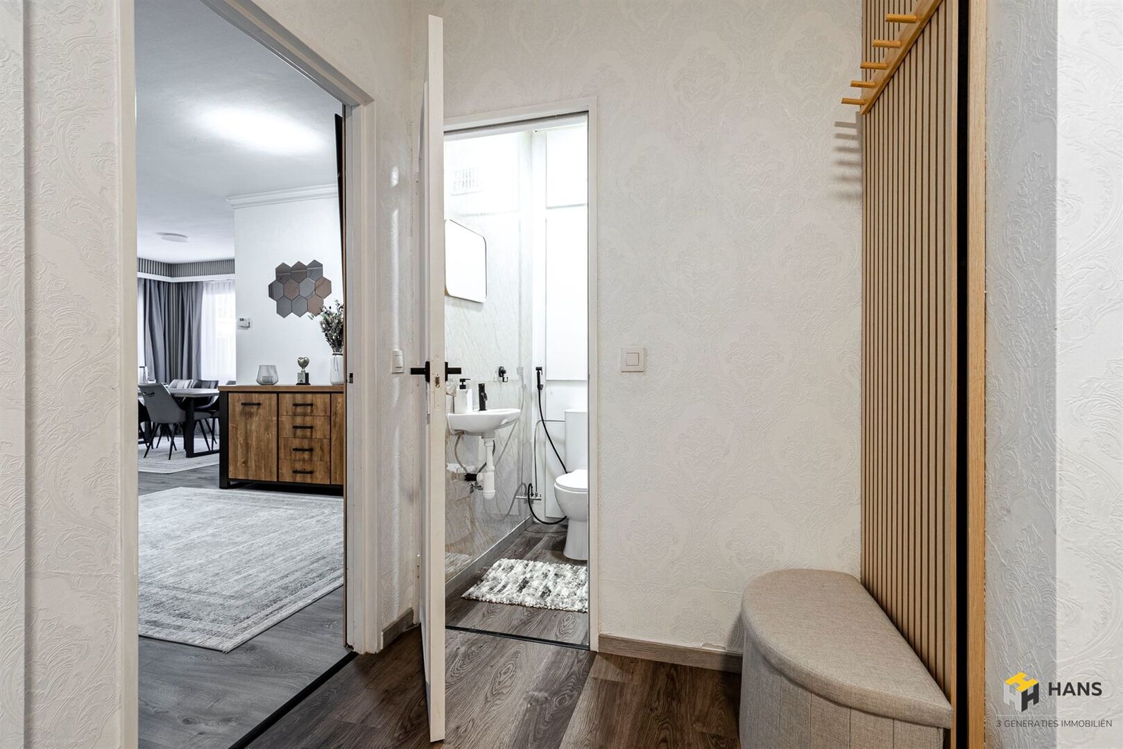 Je komt binnen in de ruime inkomhal met ingemaakte vestiairekast en apart gastentoilet. Links bevindt zich de L-vormige woonkamer van ca. 33 m², die geniet van een aangename lichtinval door de ligging in de hoek van het gebouw. Aansluitend is er de aparte keuken van 10 m², volledig uitgerust met alle hedendaags comfort.
