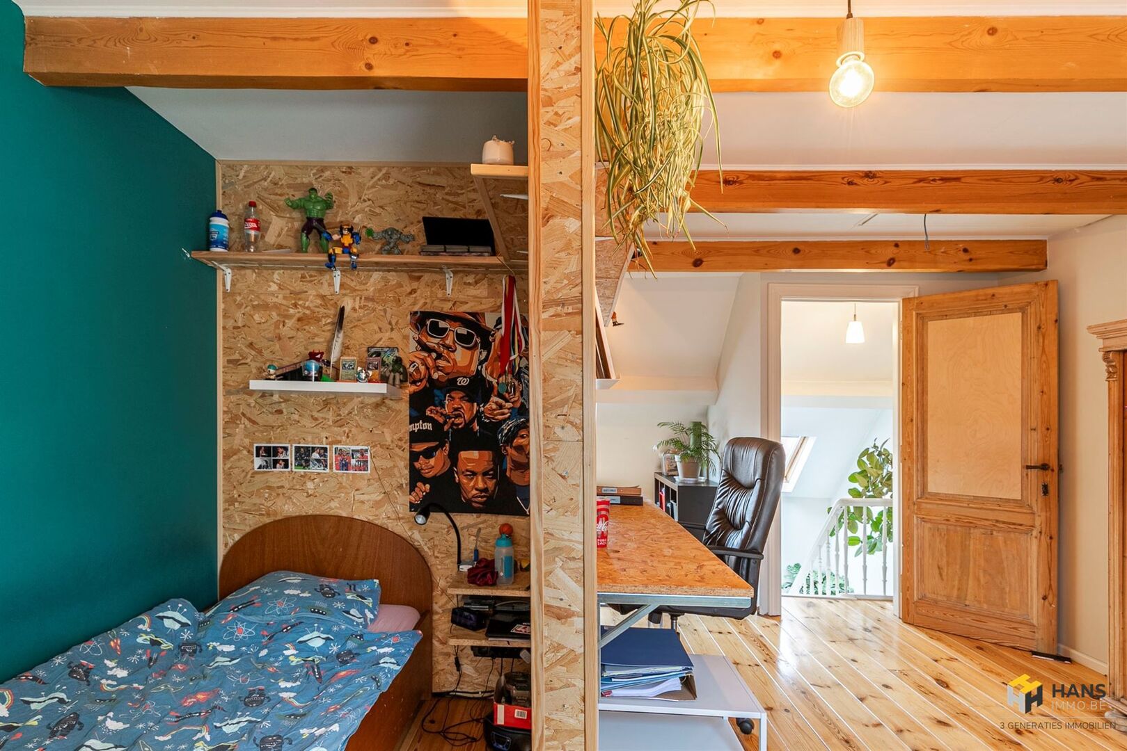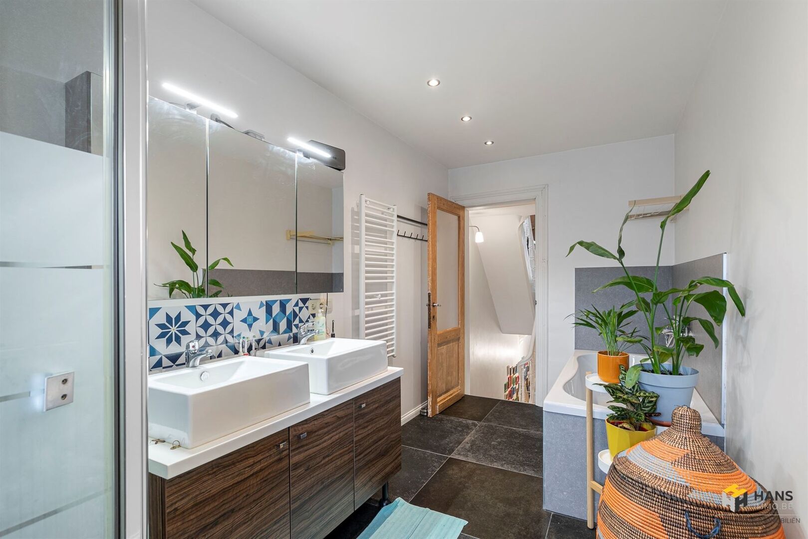 Op de tussenverdieping ligt de ruime badkamer (12 m²), voorzien van ligbad, douche, lavabomeubel, handdoekdroger en toilet. De eerste verdieping herbergt twee slaapkamers van 12 m² en 16 m². De bovenverdieping omvat een derde, bijzonder ruime slaapkamer van maar liefst 29 m² — een open ruimte die dankzij de praktische indeling perfect kan dienen als gedeelde kinderkamer of polyvalente ruimte. Tot slot beschikt de woning nog over een droge kelder (35 m²)