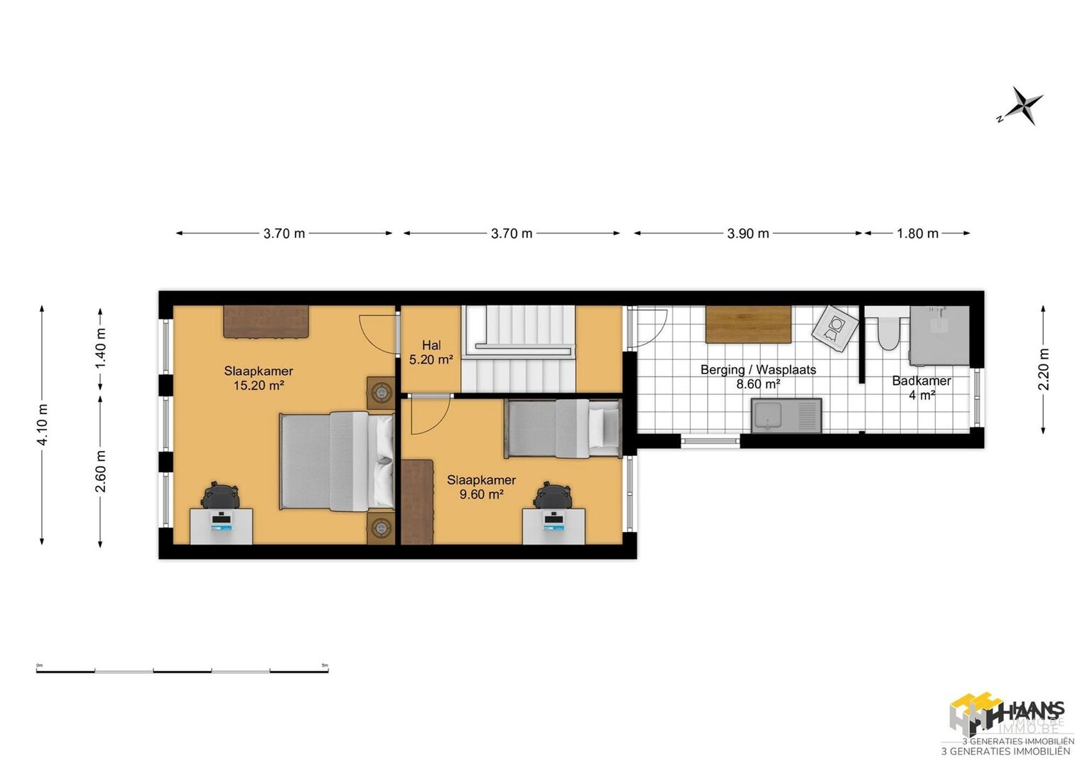 Op de eerste tussenverdieping ligt een eerste slaapkamer van 13 m². Eén niveau hoger vind je een praktische berging/wasplaats (9 m²) met aansluitend de tweede badkamer (4 m²), voorzien van toilet en douchecabine. De eerste en de tweede verdieping hebben dezelfde indeling, telkens met een slaapkamer van 15 m² aan de voorzijde en een slaapkamer van 10 m² aan de achterzijde.