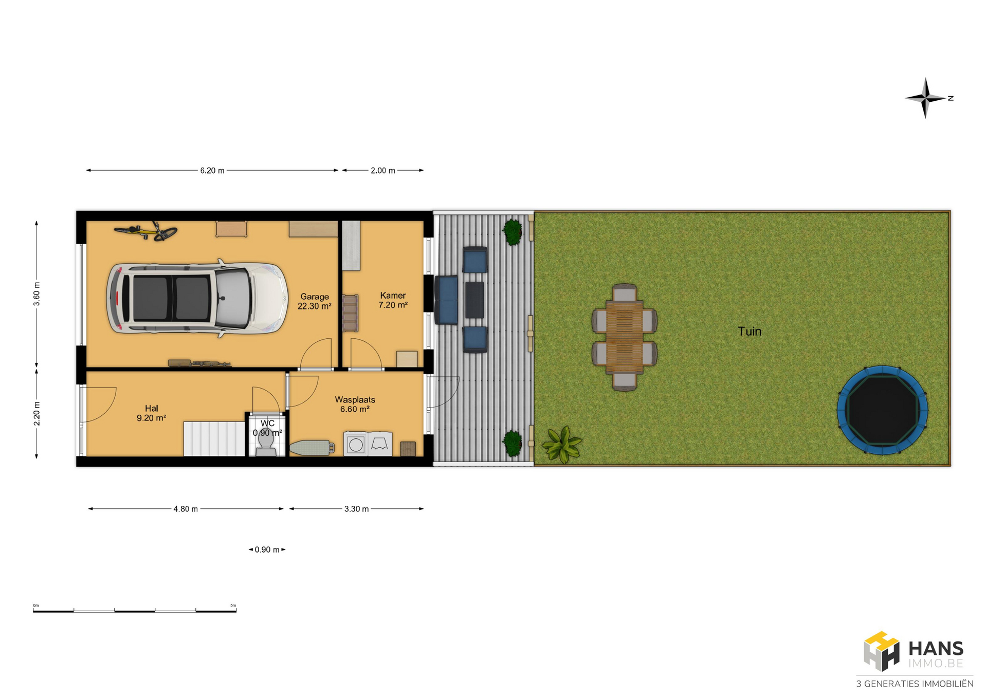 Binnenkomen doe je in de inkom-/traphal met onder de trap een apart gastentoilet. Links heb je toegang tot de inpandige garage met automatische poort. Verder zijn er achteraan op het gelijkvloers nog een extra kamer/berging (7 m²) en wasplaats aanwezig. De onderhoudsvriendelijke tuin van 80 m² beschikt over een overdekt terras en is noord-georiënteerd.