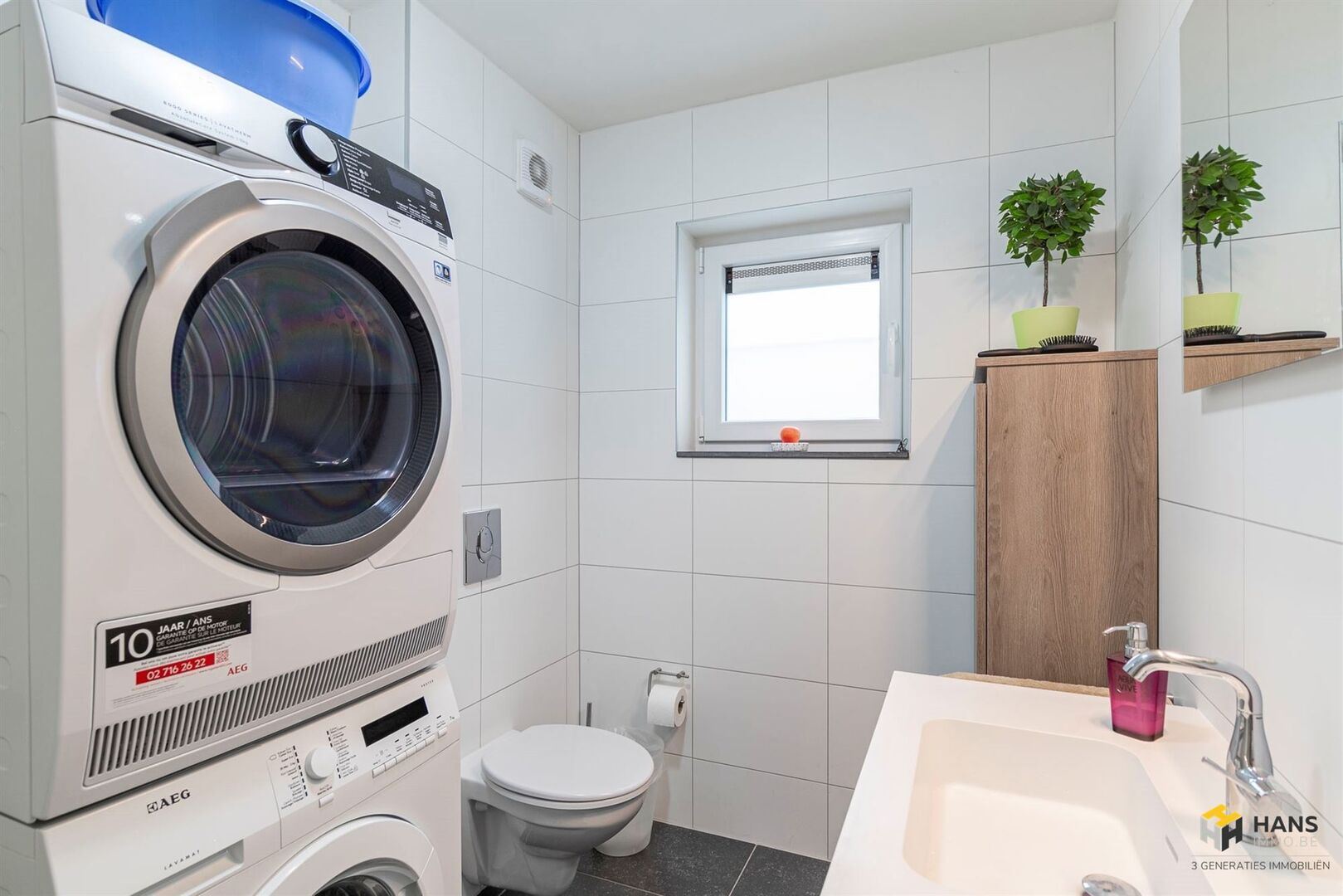 Je komt binnen in de ruime inkom-/traphal, die rechts toegang biedt tot de leefruimte met open keuken, goed voor een oppervlakte van zo’n 34 m². Ook is er nog een aparte wc met ruimte om een was- en droogmachine te plaatsen aanwezig op het gelijkvloers en achteraan is het heerlijk vertoeven in de veranda (12 m²) met zicht op de weelderige tuin (110 m²) met zuid-west-oriëntatie.