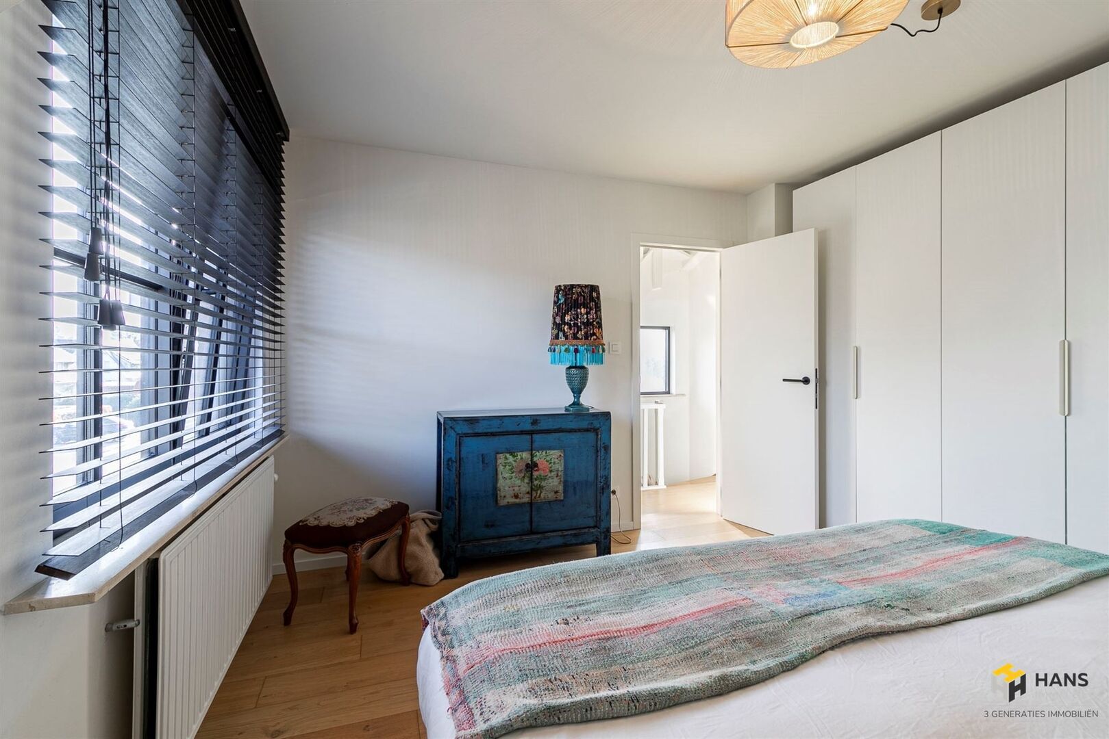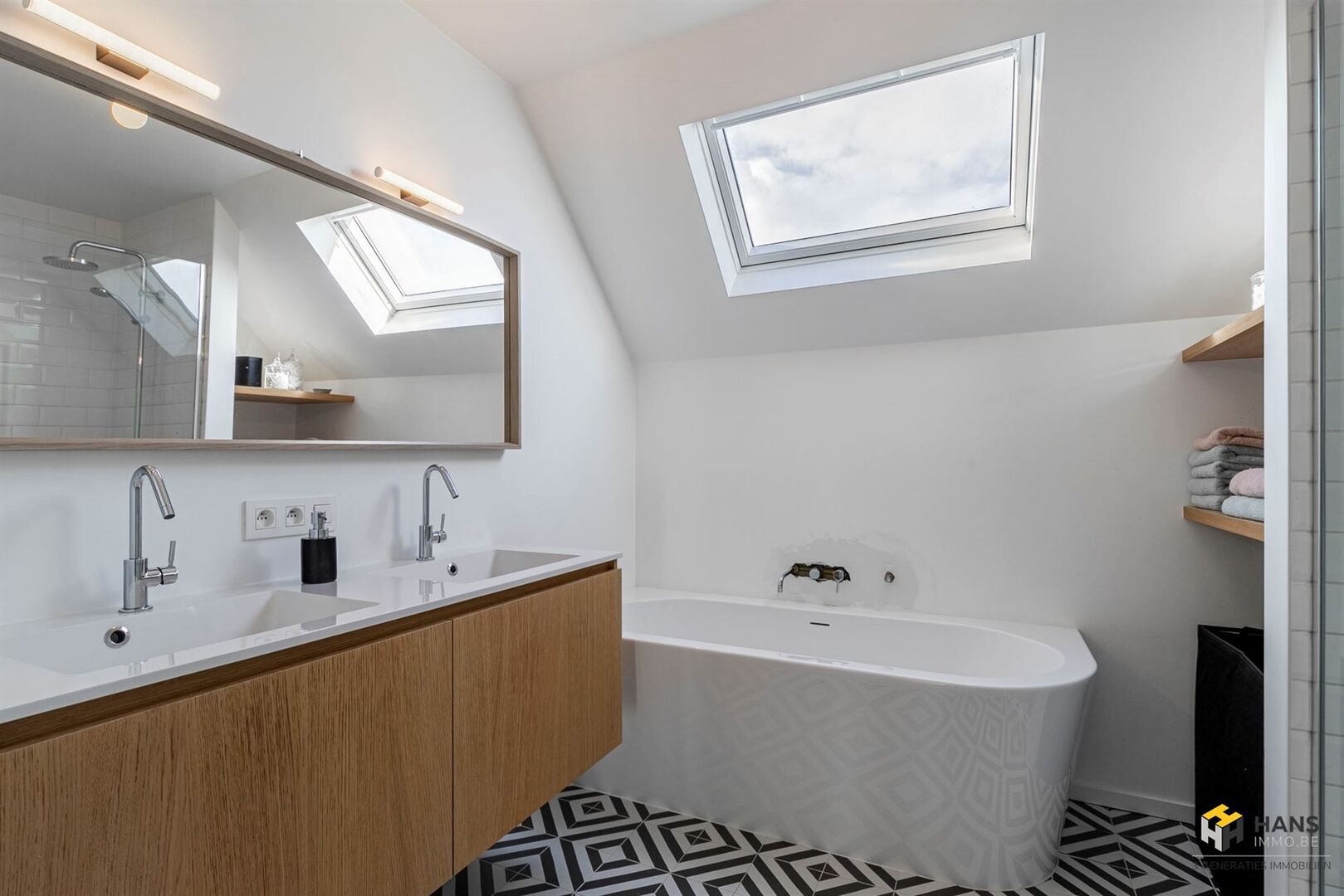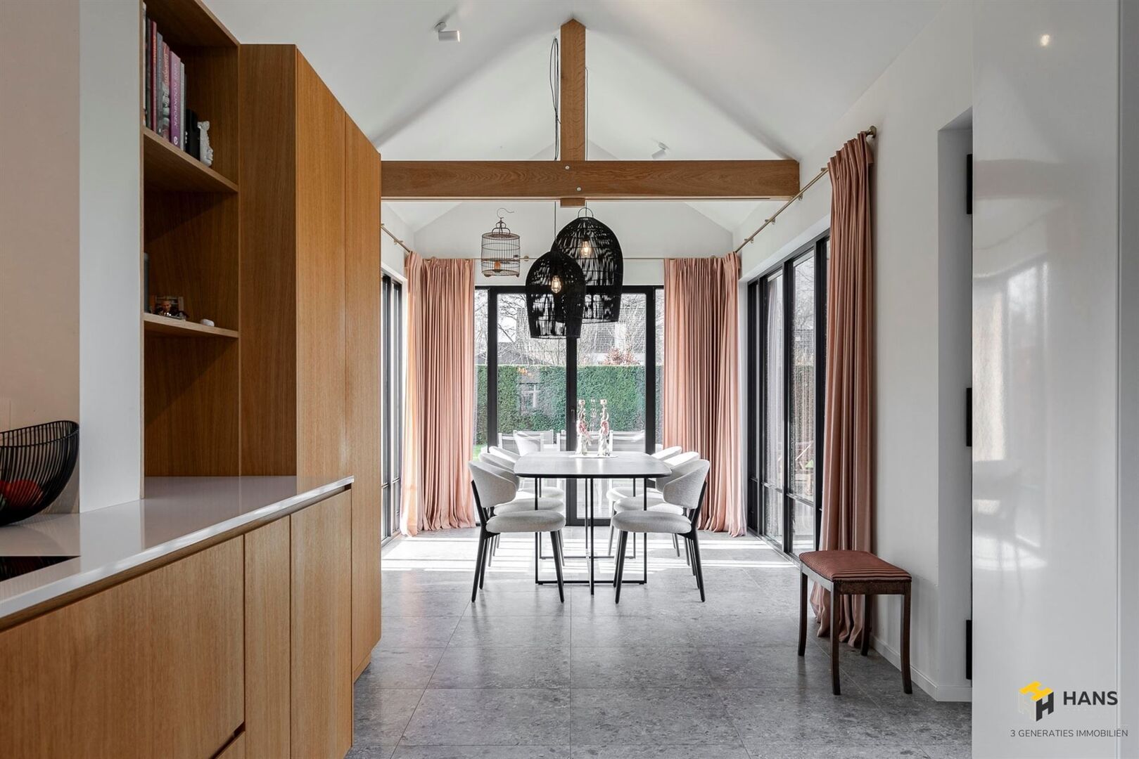 De aparte leefkeuken (31 m²) vormt een echte eyecatcher en is uitgerust met alle hedendaags comfort. Vanuit de eethoek heb je een mooi zicht op de tuin en dankzij de zonnescreens geniet je hier ook op warme dagen van een aangenaam binnenklimaat.